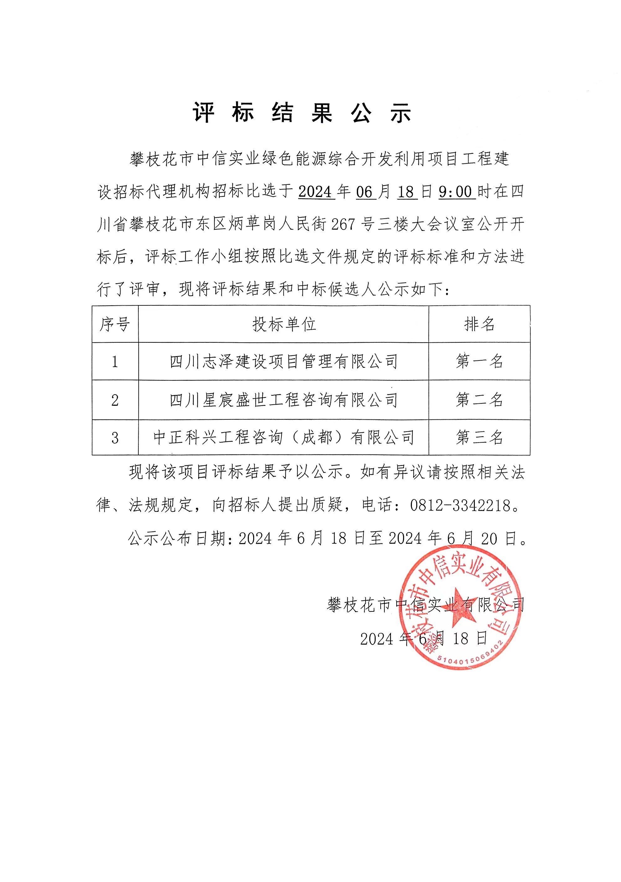 攀枝花市中信實(shí)業(yè)有限公司綠色能源綜合開發(fā)利用項(xiàng)目工程建設(shè)招標(biāo)代理機(jī)構(gòu)招標(biāo)比選評標(biāo)結(jié)果公示
